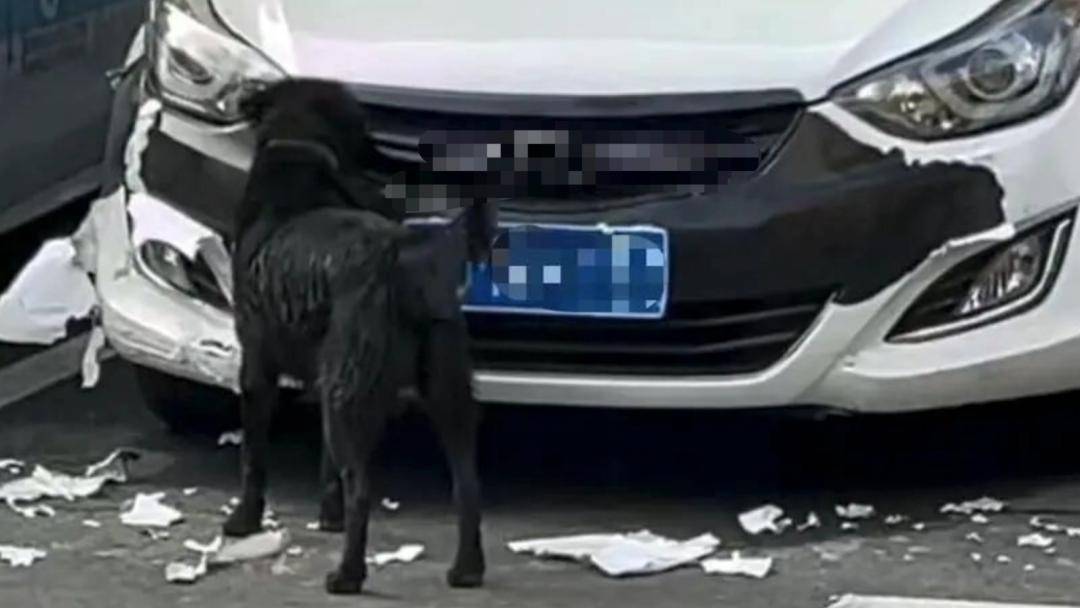 挂断电话后,马女士第一反应是遭遇诈骗,但出于谨慎还是赶往停车场查看。抵达车位时,眼前的场景让她又惊又气——自己的白色私家车前方车衣被撕得粉碎,散落一地,车身布满口水与牙齿印,一旁还站着一只戴着项圈的黑狗。